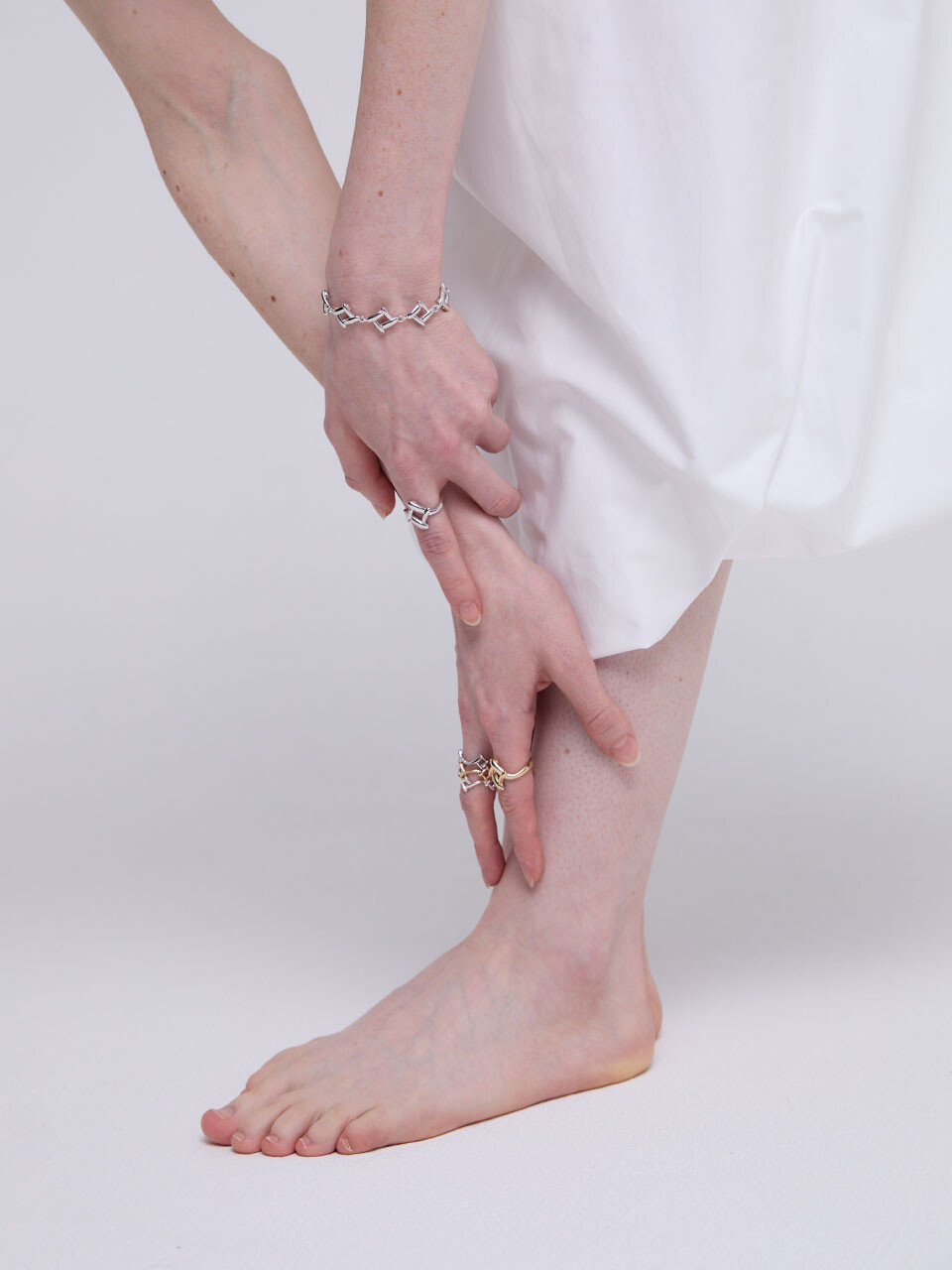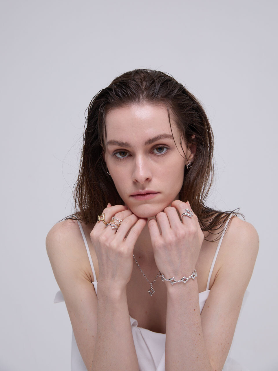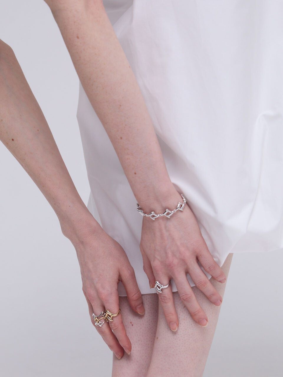 - To prevent tarnish of the product, avoid contact with water, lotion, perfume, etc. as much as possible, and when not being worn, gently wipe it with a silver polishing cloth and store it individually in a poly bag.